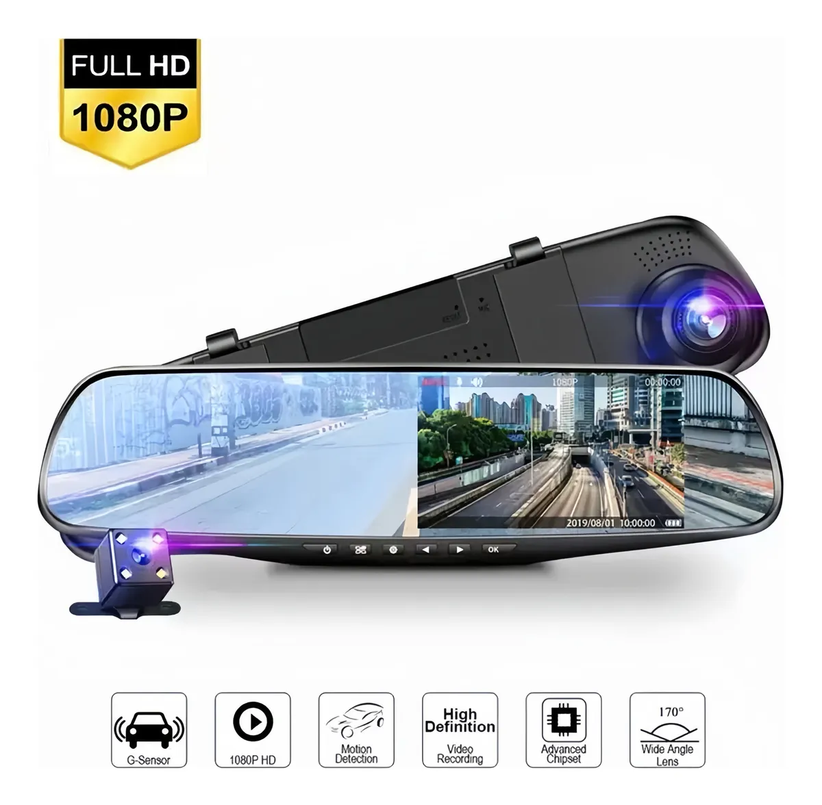 Mejora la seguridad y la visibilidad de tu vehículo con el espejo retrovisor para coche con cámara dual de 4,3 pulgadas. Este dispositivo cuenta con una resolución de video de 1080p, asegurando que cada detalle sea capturado con claridad. Su pantalla de 2.7 pulgadas te permite visualizar fácilmente las imágenes en tiempo real, mientras que el ángulo de visión de 180° te ofrece una cobertura amplia de lo que sucede detrás de ti.