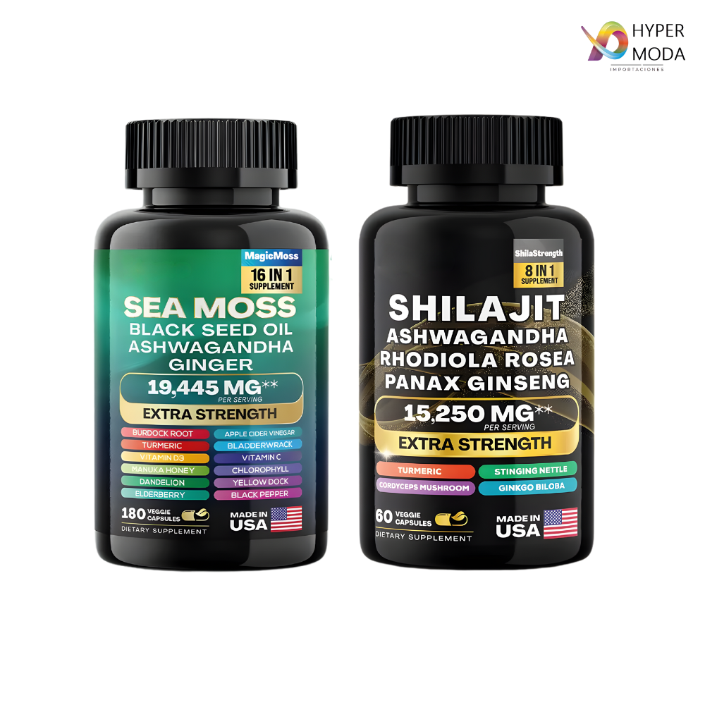 Juego de vitalidad: este juego especial combina cápsulas Shilajit, enriquecidas con 8 potentes ingredientes, y cápsulas de musgo marino, enriquecidas con más de 15 ingredientes potentes.