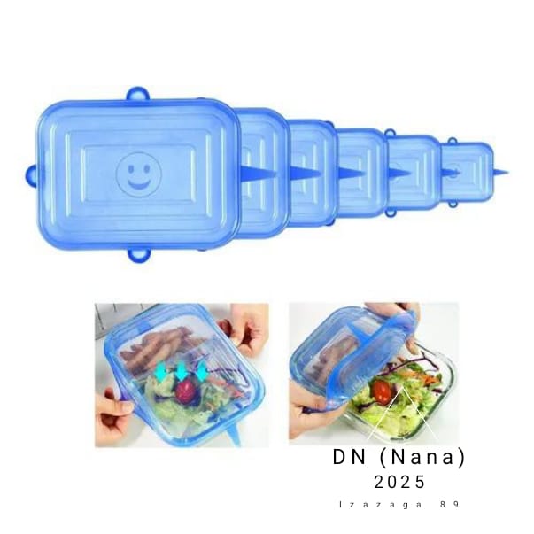 • Diseño flexible: Cada tapa está fabricada con silicona flexible, disponible en diferentes tamaños. Su diseño anti derrames asegura que tus alimentos no se derramen durante el almacenamiento.